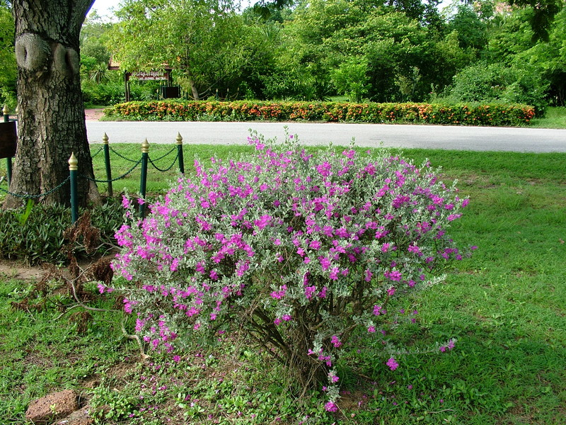 ไม้พุ่มขนาดเล็ก 1-2 ม. แตกกิ่งก้านจำนวนมาก ทรงพุ่มแน่นทึบ ใบเป็นใบเดี่ยว ผิวสัมผัสละเอียด ใบรูปไข่กลับถึงรูปรี สีเขียวอมเทา ยาว 2-3 ซม. มีขนอ่อนนุ่ม มักบิดห่อขึ้นเล็กน้อย ดอกออกเป็นช่อตามปลายกิ่ง โคนกลีบดอกเป็นสีม่วงจาง ปลายแยกเป็น 5 แฉก สีม่วงสดถึงชมพูอมม่วงแดง มักออกดอกพร้อมกันทั้งต้น |