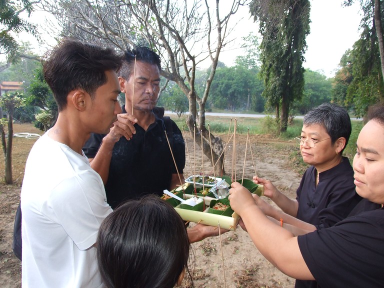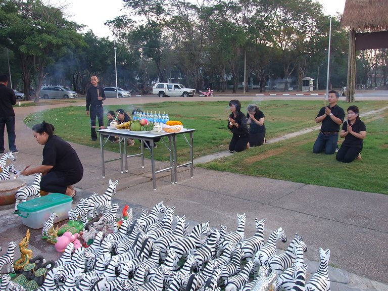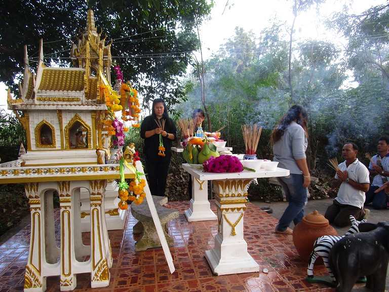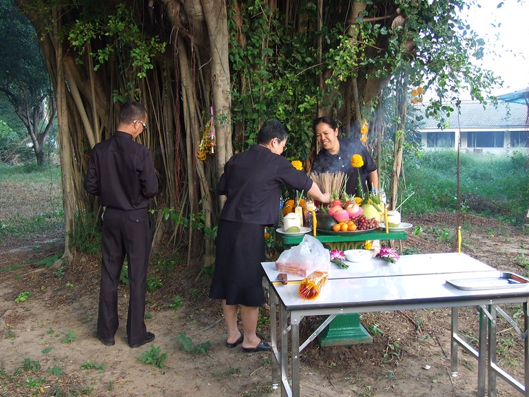 ศาลพระภูมิเจ้าที่ พระสงฆ์ 9 รูปเจริญพระพุทธมนต์ และฉันภัตตาหารเช้า พระอาจารย์นิพนธ์ ธมฺมทีโป