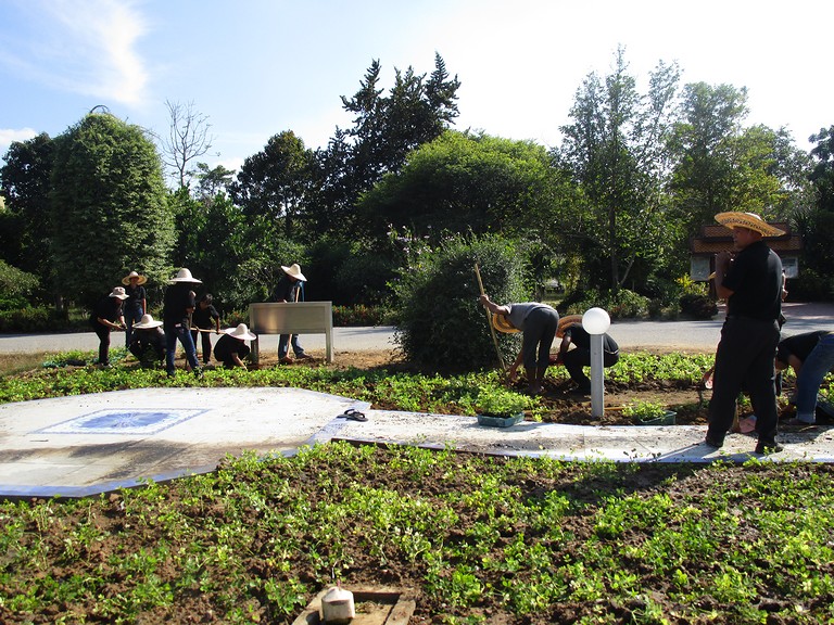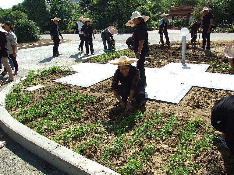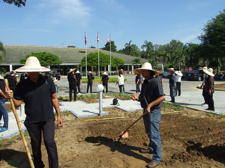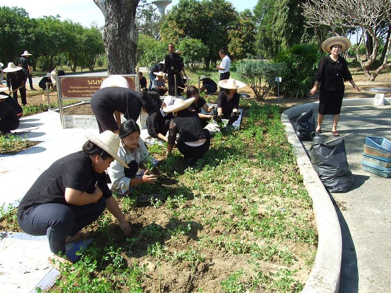 สยามินทราธิราช บรมนาถบพิตร บุคลากรร่วมกันปลูกต้นถั่วบราซิล ณ บริเวณรอบต้นนนทรีทรงปลูก