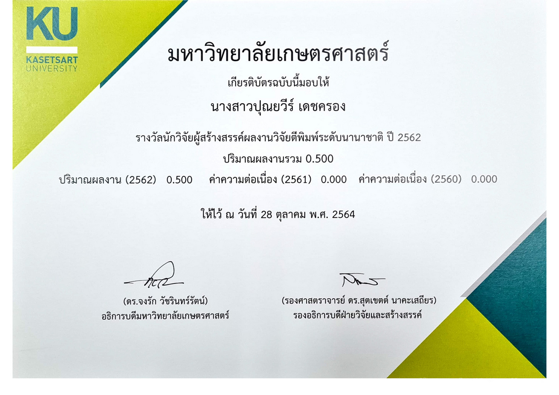 | ศูนย์ปฏิบัติการวิจัยและเรือนปลูกพืชทดลอง ศูนย์วิจัยและบริการวิชาการ คณะเกษตร กำแพงแสน ขอแสดงความยินดีกับ ดร. ปุณยวีร์ เดชครอง นักวิจัยชำนาญการ หน่วยอนุรักษ์และพัฒนาทรัพยากรชีวภาพ ที่ได้รับรางวัลนักวิจัยผู้สร้างสรรค์ผลงานวิจัยตีพิมพ์ระดับนานาชาติ ปี 2562 ในงานมอบรางวัลผลงานวิจัยมหาวิทยาลัยเกษตรศาสตร์ ปี 2562 และรางวัลผลงานวิจัยที่สร้างผลกระทบ ปี 2564 เมื่อวันที่ 28 ตุลาคม 2564 จัดโดย สถาบันวิจัยและพัฒนาแห่งมหาวิทยาลัยเกษตรศาสตร์ |