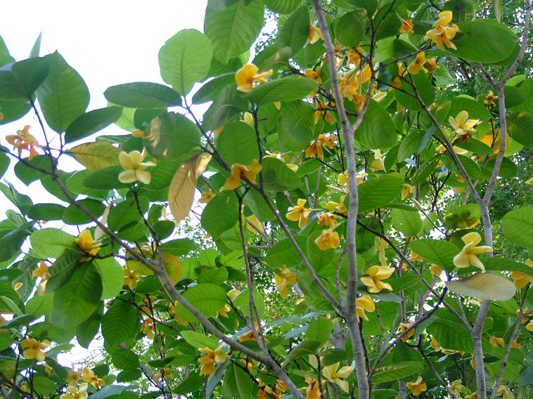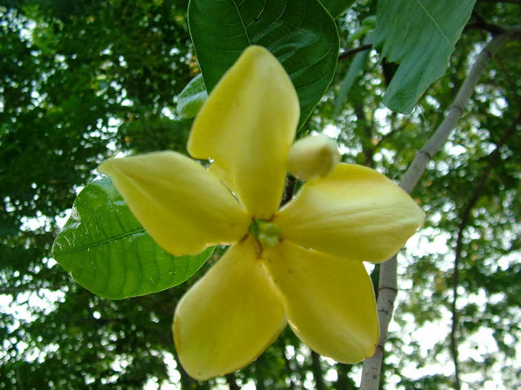 ดอกเดี่ยวสีเหลืองสด เปลี่ยนเป็นสีซีดหรือขาวนวลเมื่อร่วง ออกที่ซอกใบ มีกลิ่นหอม ขนาดผ่านศูนย์กลาง 5.5-7 ซม. |