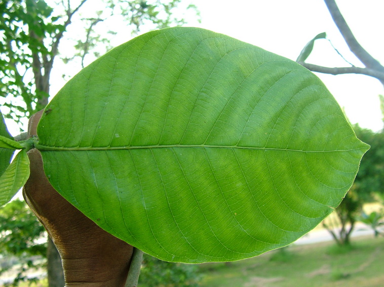 เป็นใบเดี่ยว เรียงตรงข้าม รูปวงรีขอบขนานหรือแกมรูปไข่กลับ กว้าง 12-18 ซม. ยาว 22-30 ซม. ปลายใบแหลมหรือมน โคนใบมน ขอบใบเรียบ มีหูใบเป็นปลอกที่บริเวณรอบกิ่ง หลุดร่วงง่ายเห็นรอยแผลชัดเจน |