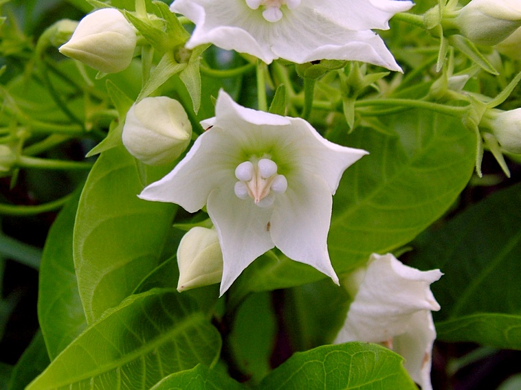 ดอกสีขาว มีกลิ่นหอม ออกเป็นช่อที่ซอกใบ ใกล้ปลายกิ่ง ช่อดอกยาว 2-6 ซม. มี 10-15 ดอก กลีบดอกเชื่อมกันเป็นรูปถ้วย ปลายแยกเป็น 5 แฉก เกสรผู้ 5 อัน ติดกันกลางดอกเป็นรูปลูกศร |