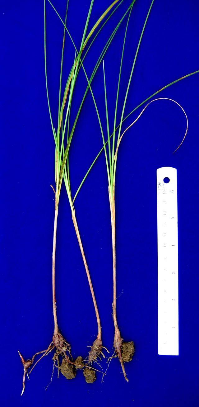 เป็นไม้ล้มลุก มีลำต้นอยู่ใต้ดินมีลักษณะเป็นหัวกลมมีตาจำนวนมาก และสามารถแทงไหลไปได้ไกลแล้วเกิดหัวใหม่เจริญขึ้นเป็นต้นเหนือดิน ลำต้นสั้น ใบเกิดที่ลำต้นชิดแน่นโดยเป็นกาบใบหุ้มซ้อนม้วนทับกันชูขึ้นเหมือนลำต้น แล้วแผ่เป็นแผ่นใบแบนรูปแถบยาวปลายแหลม กลางใบเป็นสันร่องผิวใบเรียบสีเขียวเข้ม กว้างประมาณ 0.5 ซม. ยาว 25 ซม. ดอกเกิดที่ปลายยอด ก้านช่อดอกเป็นรูปเหลี่ยมสีเขียวเข้มแทงขึ้นสูง ยาวประมาณ 30 ซม. แล้วแตกเป็นช่อย่อยอีกหลายช่อ ดอกย่อยสีน้ำตาลจำนวนมาก ผลรูปขอบขนาน ปลายแหลมสีน้ำตาลหรือสีดำ |